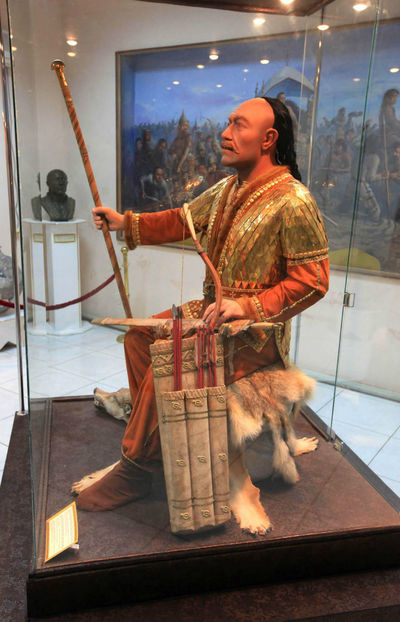 Статный воин за стеклом сверкает золотым костюмом. Он царственно сидит. Левая рука повелительно сжимает некий посох – символ власти, правая на коленях придерживает спрятанный в ножны меч. У ног стоит полный стрел колчан. Настоящий царь всех царей! Откуда он здесь взялся?