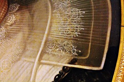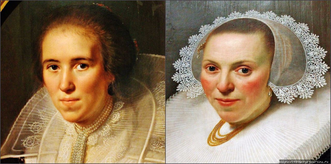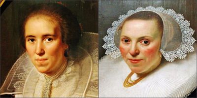 Имеются отличия и в одежде. Молодая, как и положено её возрасту и, вероятно ещё недостаточно высокому общественному положению, предстаёт перед нами в скромном обличье, если только массивную жемчужную цепь, что обвивает её шею, да брабантские тончайшие кружева на чёрном бархатном платье можно такими назвать.