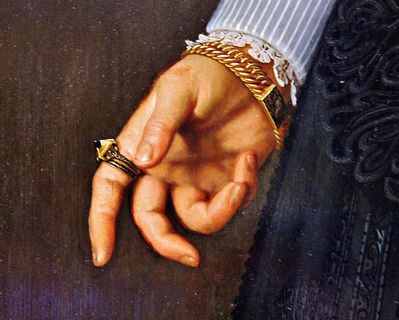 Также видим всевозможные золотые украшения – браслеты, цепи и кольца. Выделяются роскошью и перчатки, дама не зря их держит в руках, мол, пусть все видят и восхищаются.