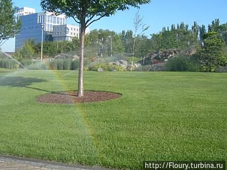 В парках Кованных фигур и на бульваре Пушкина мы заметили сидящих на травке родителей и бегающих деток. Возле Дондасс-арены включили систему орошения. Да и таблички просят по газонам не ходить.