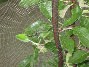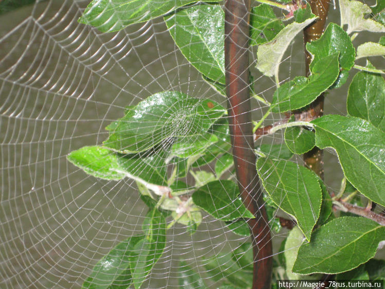 Тем не менее меня удивил не туман, а огромное количество паутины в саду. Она, конечно, была сплетена не за 1 ночь. Просто капельки росы сделали ее видимой. На то, чтобы сплести качественную паутину, требуется несколько часов. Один паук все еще продолжал "работать"
