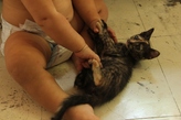 С Женей они сразу нашли общий язык. Она конечно не всегда рассчитывала силу, но котик не убегал от нее, а наоборот искал. Они вместе играли, а хозяева так и не искались. Ветеринар сказала, что такие трехцветки всегда девочки, более того, что она здоровая и чистенькая, и мы так и не решили ничего. Пока она своей обезьянней мордочкой приветствует Женю и периодически залезает на ёлку.