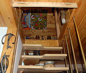 В доме фактически две комнаты. На первом этаже – студио. Здесь и кухня, и рабочий кабинет, и гостиная, и спальня для гостей со своими спальниками на полу. На второй этаж ведет деревянная лестница. И, хоть она крутая, но дизайн ступенек таков, что подниматься по ним даже в темноте очень удобно – ноги никогда не зацепятся за следующую. Там, на втором этаже, тоже музей сувениров – настоящих произведений искусства стран Востока и Центральной Америки.