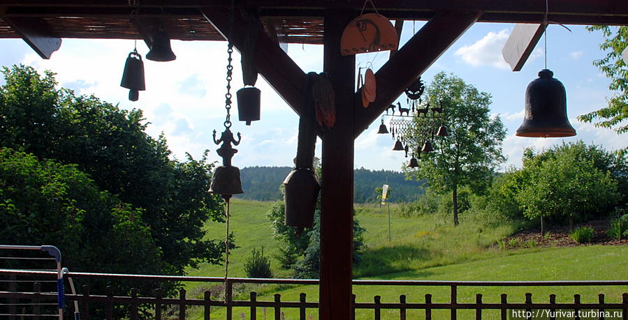 Вход на веранду украшен разными колоколами и колокольчиками. Они самого разного стиля и происхождения – ими можно и созывать буддистских монахов, и отслеживать убежавшую корову. С веранды открываются спокойные виды окружающих зеленых холмистых полей и перелесков. Стол и несколько стульев. Это место хорошо в любое время дня и года.