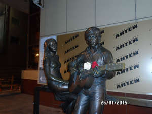 Вечерний небоскреб Высоцкий, напоминает гитару с туго натянутыми струнами....вчера они по особому звенели, в Музее Высоцкого поклонники вспоминали Владимира Высоцкого, которому 25 января исполнилось бы 77 лет....полный зал, знакомые до боли песни. А у входа в небоскреб кто то с любовью вложил в руки Марине и Володе живые розы, как знак бесконечной любви....