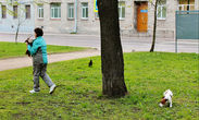 Такое общение вороны с хорьком продолжалось минут десять. Женщина постоянно меняла дислокацию, оттаскивая своего резвого питомца от вороны, однако последняя, не теряя надежд, уверенно шагала следом.