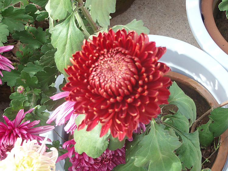 Яркие, пестрые хризантемы в горшочках, заботливо выставленные в парке на радость