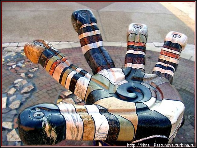 Произведения Фриденсрайха Хундертвассера щедро разбросаны по всему миру. В Токио и Лиссабоне, Вене и Магдебурге, да и во многих других городах вы можете увидеть творения мастера. В середине 90-х около Арабо-Израильского общинного центра в яффском районе Аджами поставил фонтан-поилку в виде открытой ладони и излюбленного символа, с которым он не расставался всю жизнь, – спирали, "символа жизни и смерти".