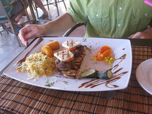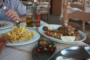 Что я могу сказать: на Кипре любят мясо, причем все его виды: говядину, и курицу, и свинину, ягнятину, баранину. Знаменитое клефтико так попробовать и не успели. Из того, что успели попробовать, больше всего понравилась шефталья — колбаски из свинины, завернутые в бекон или в бараний сальник. Очень сочное блюдо! К нему подавали тзазыки — соус/салат из йогурта и мелко нарезанных огурцов, также картофель фри, который подают практически ко всем блюдам из мяса и овощи и зеленый салат. Стоит ли добавлять, что такой тарелки мне хватило за глаза? ;)