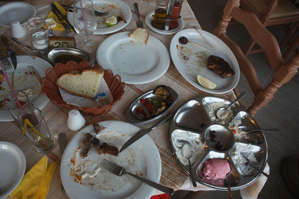 Мезе. Различные виды мяса, уже не скажу, где какое. Под красным соусом, кстати, долмадес — рис с фаршем, завернутый в виноградные листья. Вкусная вещь, однако!
