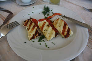 Еще я попробовала сыр халуми — его тоже делают на гриле. Сыр халуми — это сыр из козьего молока. Солёёёёный! Но вкусный.