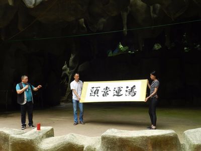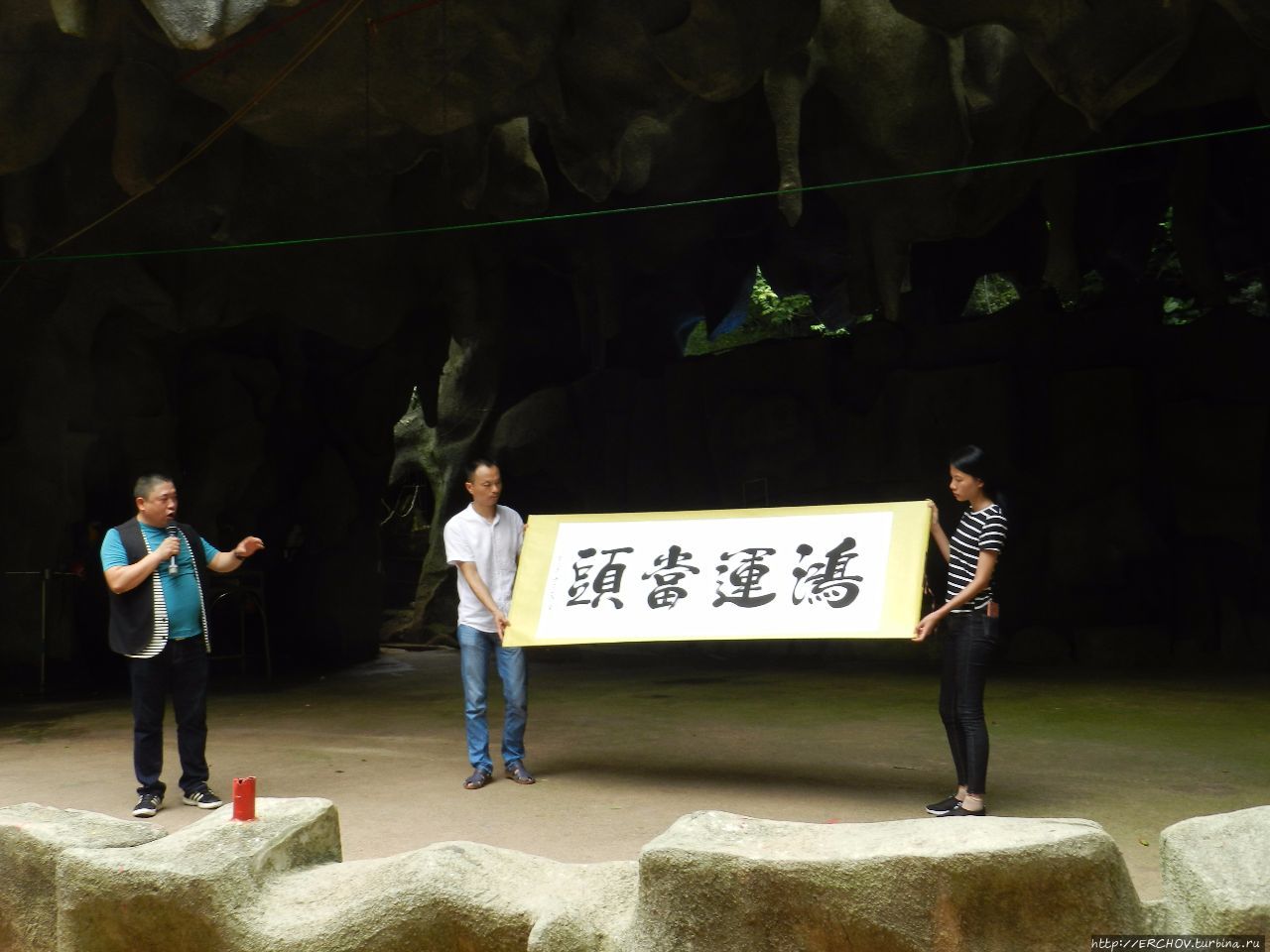 Экскурсия на Остров Обезьян (南湾猴岛 – Nanwanhoudao) Рядом стоящий художник принялся рисовать иероглифы. Часть зрителей выскочили со своих мест, образовав толпу.
