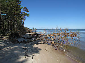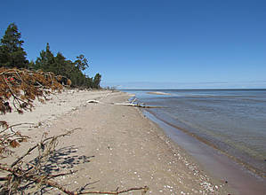 Большая серо-коричневая лиса с дорожной насыпи лениво проводила мою машину усталым взглядом дорожного полицейского, не двигаясь с места и не пытаясь спрятаться в лесу. Ровная лента идеальной асфальтовой дороги шуршала под колесами, плавно уходя в мокрый мираж на горизонте. На пустой автостоянке у речки Ирбе меня встретили две косули, осторожно, одна за другой переходящие дорогу по только им известному маршруту, не обращая на меня никакого внимания, греющийся у обочины ежик и мощная завораживающая полифония птичьего пения, компенсировавшая холодное безмолвие движения мутной речной воды к морю.