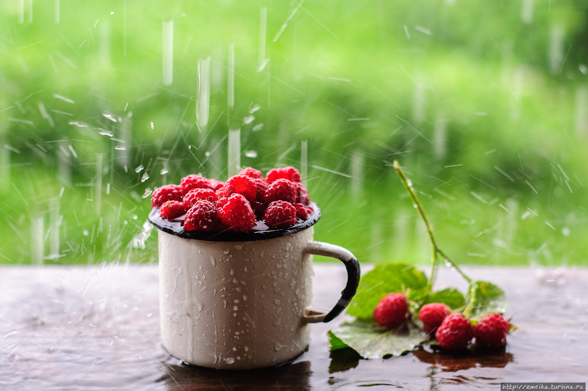 В закромах нашла старую кружку, вышла на крылечко дома, собрала композицию, и тут внезапно пошел дождь! Первым делом хотелось поскорей скрыться в доме, но немного задержавшись и помокнув, я поняла, что получила подарок от ливня — сочные, летние, яркие кадры!