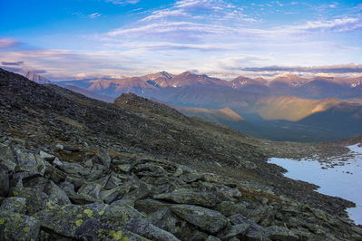 Это снимок сделан уже на закате, мы сильно задержались и возвращались в лагерь уже ночью. Как бы я ни устала, ни промокла и ни была покусана комарами, я абсолютно не жалею о походе. С Манараги открывается прекрасный вид на горы в сторону Азии, плато Оленеводов, гору Народа и другие. А цвет! От персикового к сиреневому — просто сказка!