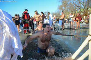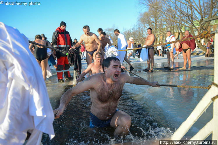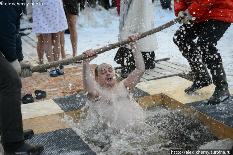 В холодную воду с мороза — дикий стресс для всего организма. Зато как хорошо стоять в теплом пуховике и смотреть на ледяные брызги! Может решусь в следующем году снова.