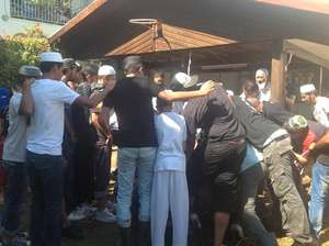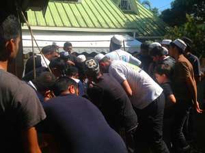Быка отвязывают у стойки, где он провел неделю и акуратно перемещают на землю, головой в сторону Мекки. Никаких криков, говорят почти шепотом. Животное не кричит, не бьется, все абсолютно тихо.