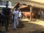 Быка отвязывают у стойки, где он провел неделю и акуратно перемещают на землю, головой в сторону Мекки. Никаких криков, говорят почти шепотом. Животное не кричит, не бьется, все абсолютно тихо.