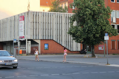 И вот мы неспешно направились в сторону центра, впитывая в себя повседневный Берлин в зданиях и отелях, магазинчиках и ресторанах, вывесках и табличках на немецком, аллеях и скульптурах и во взглядах прохожих. Периодически нам попадались русскоязычные негромко гомонящие компании. Мы улыбаемся друг другу и расходимся... Солнце вот-вот скроется, но вечер не несёт напряжённости, а обволакивает спокойным благодушием. Мы выходим на прямую неширокую улицу- Курфюстенштрассе: обычные дома, старая церковь и множество ресторанов с террасами, заполненных посетителями. Замечаем припаркованный блестящий "Туарег" с распахнутой дверью. Из нутра машины доносится весёлая мелодия, а рядом в такт музыке танцует, никого не стесняясь, девчонка — ладненькая фигурка, короткие шорты и розовая футболка, два хвостика на голове. На противоположной стороне улицы её движения повторяет другая. И этот тандем завораживает своей непосредственностью...