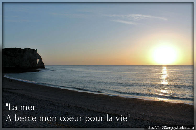И вот однажды фантазии чудесным образом материализовались. Случилось это в Нормандии в маленьком городке Этрета. Стоял тихий майский вечер, солнце медленно клонилось к линии горизонта, и приближающая ночь наполняла воздух прохладой. От моря по всему побережью волнами разносился шум прибоя. В его размеренных ритмах отчётливо слышался некий мотив. Удивительно, но это была именно та старая, старая песня.
