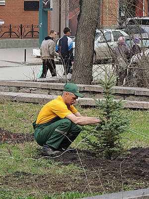 В один жаркий, даже больше душный весенний день собрались МУП садить елочки и в парковой зоне под окном моей работы.