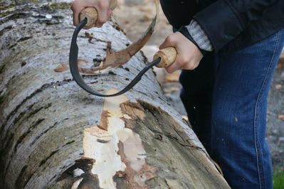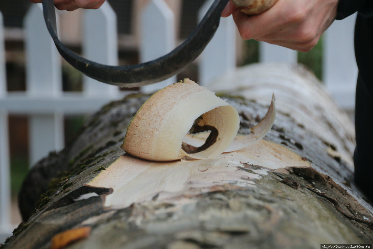 Первое, что нужно сделать — это очистить ствол нужной формы от коры и сучьев. Задача понятна. Выполняем ее со “свистом и пением” при помощи традиционного инструмента, который называется скребок.