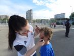 Здесь же на площадке перед стадионом желающие могут и мячик слегка попинать,
