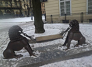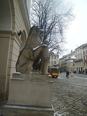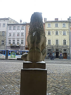 Трудно, гуляя по Львову, не фотографировать львов. Они повсюду — на гербе города, на стенах домов, на вывесках, сидят у дверей и скамеек.