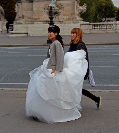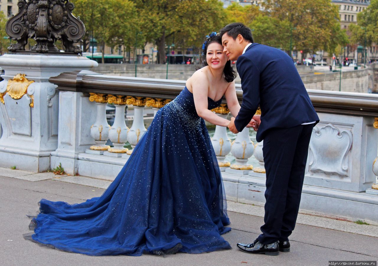 Да, ребята с синем свадебном убранстве, потешили нас и своими нарядами, и свои прекрасным настроением. Но они стали завершающими в целой череде свадебных пар, которых мы увидели на набережной реки Сена...