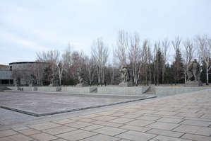 Но на меня самое сильное впечатление Мамаев Курган произвел, когда я оказалась там однажды совершенно случайно (уже даже и не помню, почему именно) довольно холодной зимней ночью. Надо сказать, что темнота часто скрывает лишние детали, и многое в ночи воспринимается иначе. Я шла между стен-руин. Стены-руины- это не только оригинальная композиция из клятв бойцов, призывных лозунгов, моментов войны, застывших в бетоне. Они еще "говорят" — аудио-сопровождение включает обрывки сводок с фронта, радиосообщения военных лет, звуки разрывающихся снарядов, падающих бомб, криков бойцов, бегущих в атаку... Днем стены тоже "звучат", но шум от дороги, голоса людей и многое другое отвлекает. Мало кто долго прислушивается к "голосу стен", спеша поскорее подняться вверх, посмотреть, как можно больше. Я тоже слышала их днем, и не раз. Но как же иначе они звучали той январской ночью! Несмотря на пронизывающий ветер, я стояла, слушала и не могла уйти. Словно вокруг меня вдруг ожило то далекое прошлое...