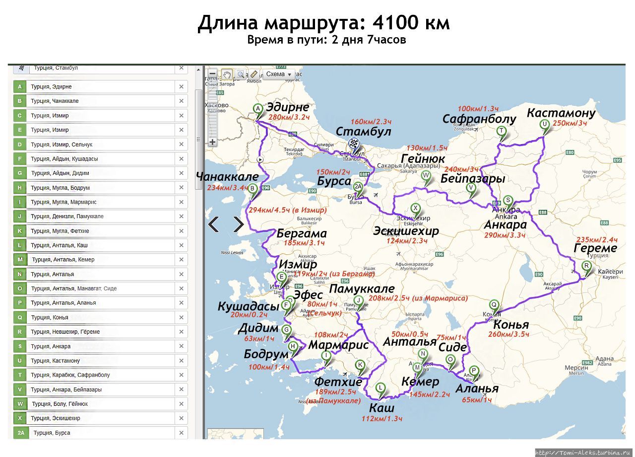 Наконец-то после долгих трудов составил окончательный маршрут путешествия на 2 недели. Длина маршрута 4100 км. Допускаю, что времени нам может не хватить — у нас ровно 14 дней. Первый и последний пункт — Стамбул, в котором надо посмотреть самое главное. Друзья, гляньте, плиз (кто в теме) что бы вы выкинули из этого маршрута в случае нехватки времени. А, может, что-то чем-то заменили? Я уже понял, что данная форма обмена опытом на Турбине очень не развита. Но, тем не менее — вдруг кто-то захочет сказать умную речь и наставление перед путешествием. (шутка)