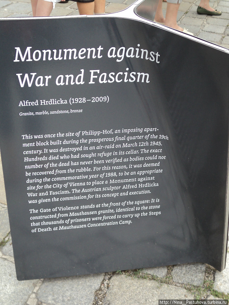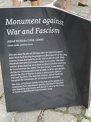 Но сначала о памятниках. Мемориал против войны и фашизма расположен на площади Гельмута Цилька (бывшая Альбертинаплатц) в Вене, напротив дворца Альбрехта, с обратной стороны венской оперы. На этом месте ранее был расположен двор Филипп-Хоф, монументальное жилое строение, которое 12-го марта 1945 года было разрушено во время бомбардировок. Погибли сотни людей, которые прятались в подвалах. Засыпанных не смогли спасти, их точное число не было установлено. На этом месте в 1988г. и был установлен мемориал.