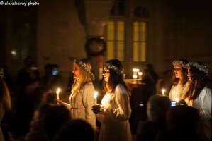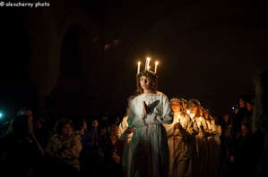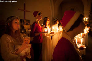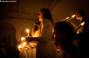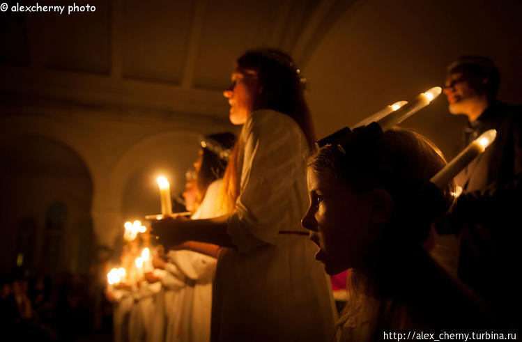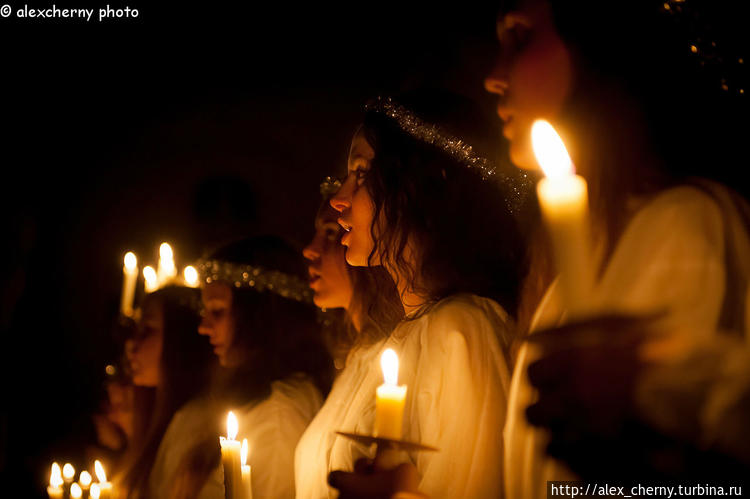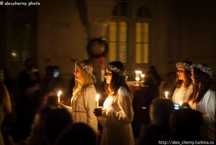 Вот например 13 декабря шведы отмечают очень красивый праздник — St. Lucia (Святой Люсии). Мистерия происходит в шведской церкви St Katarina (Св Екатерины) в простом русском городе St Petersburg (Санкт Петербурге)