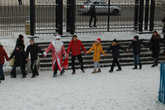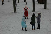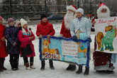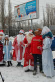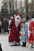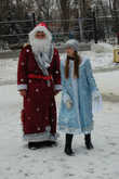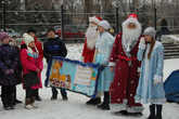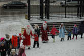 Сегодня в сквере Дружбы народов поздравляли с .Новым годом четыре молодых Деда-Мороза, четыре юных снегурочки и одна молодая лошадь.