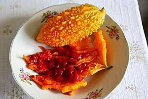 Поискал, оказалось, что по-русски этот род растений называется "момордика" (по-английски momordica), бывает разных видов и встречается в тропической Азии, Африке и Австралии. Родственен он арбузам, дыням и прочим кабачкам. А в Старых Дубоссарах он, выходит, стал молдавским гранатом.