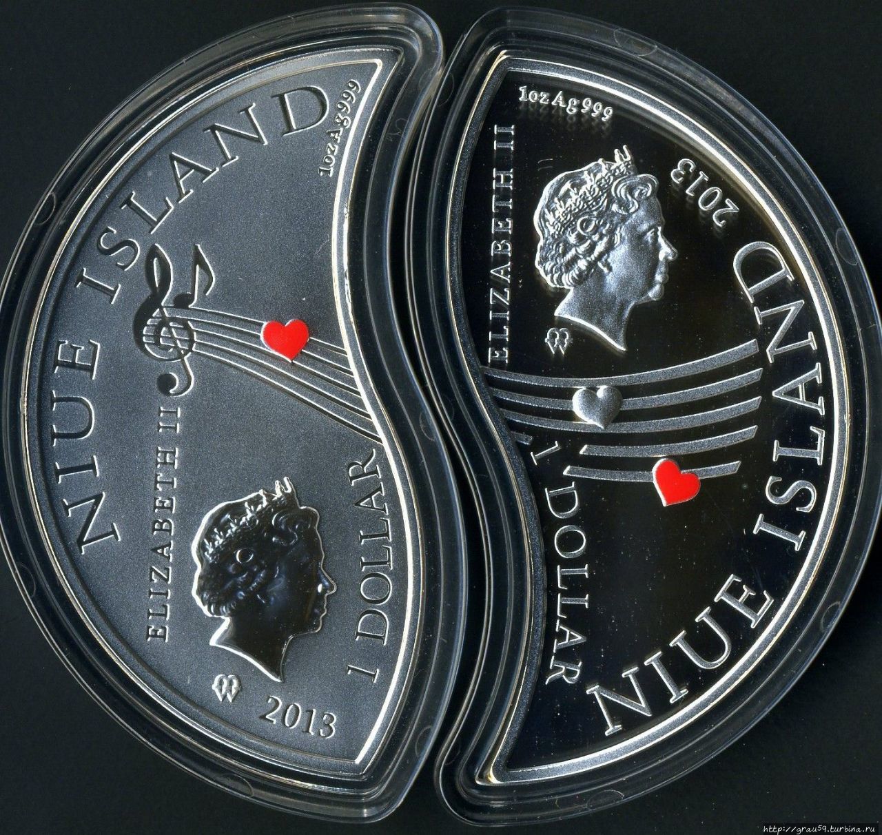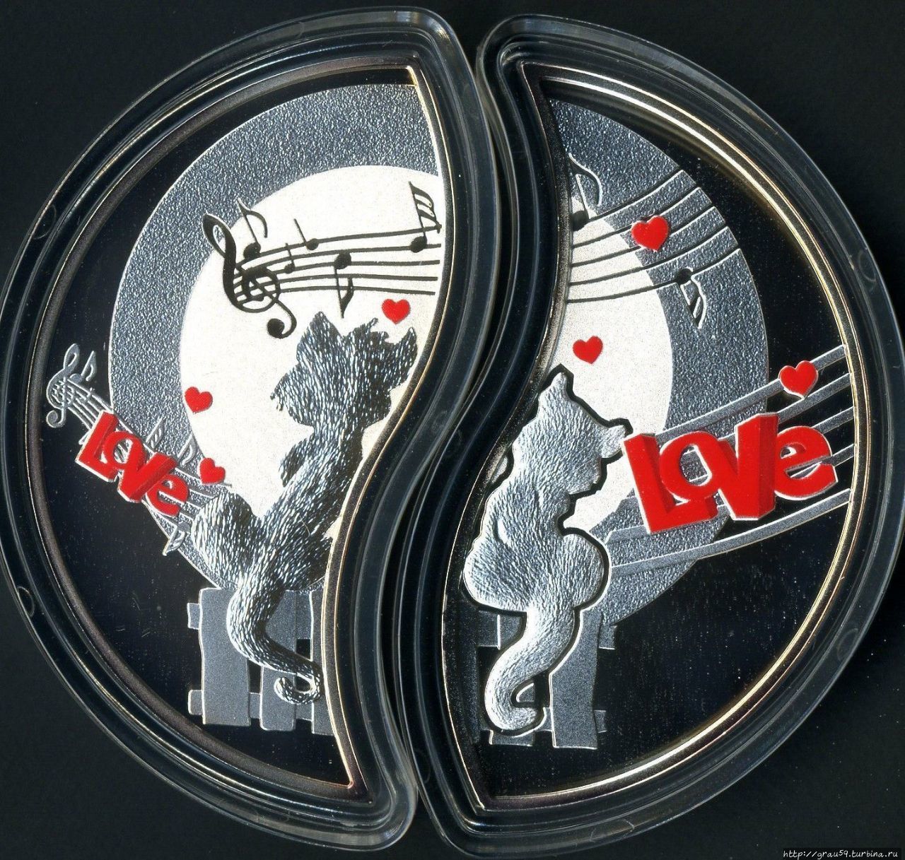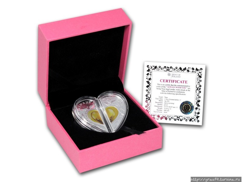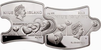 Ко Дню святого Валентина была изготовлена долларовая монета-пазл с голубками, сердечками, цветочками, словами "Я", "Ты" ("You", "Me").