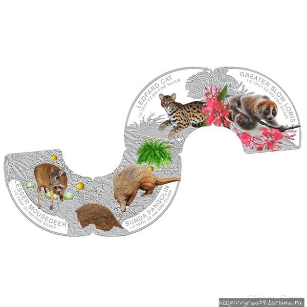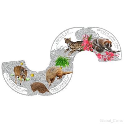 Реверс: на первом фрагменте показан азиатский малый оленёк (канчиль). На втором — яванский ящер (панголин). На третьем — бенгальская (карликовая) кошка. На четвертом — медленный лори. Легенды частей отображают название зверей на английском языке («Lesser Mousedeer», «Sunda Pangolin», «Leopard Cat», «Greater Slow Loris») и технические данные изделий. Украшением монеты служат растительные элементы.