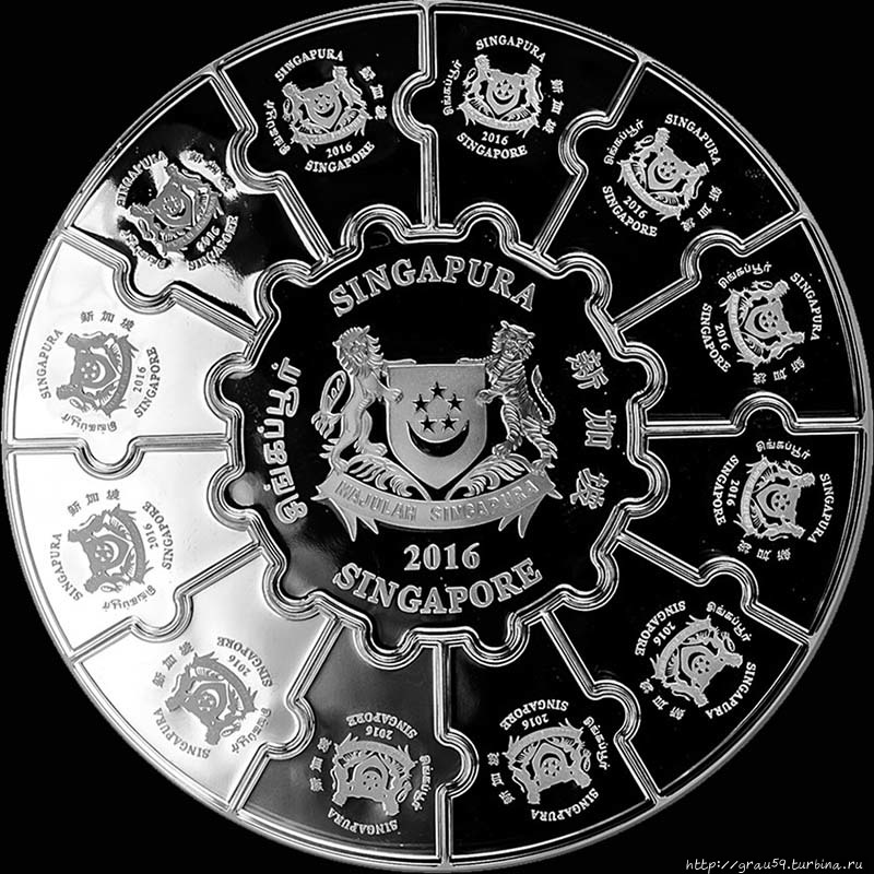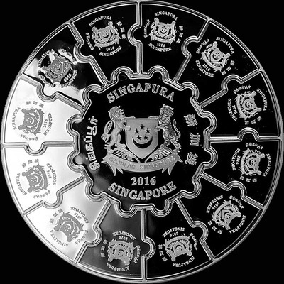 На каждой из частей аверса серебряной монеты отчеканен герб Сингапура, указан год . Вокруг герба выгравировано название города-государства на четырех официальных языках — английском, китайском, малайском и тамильском.