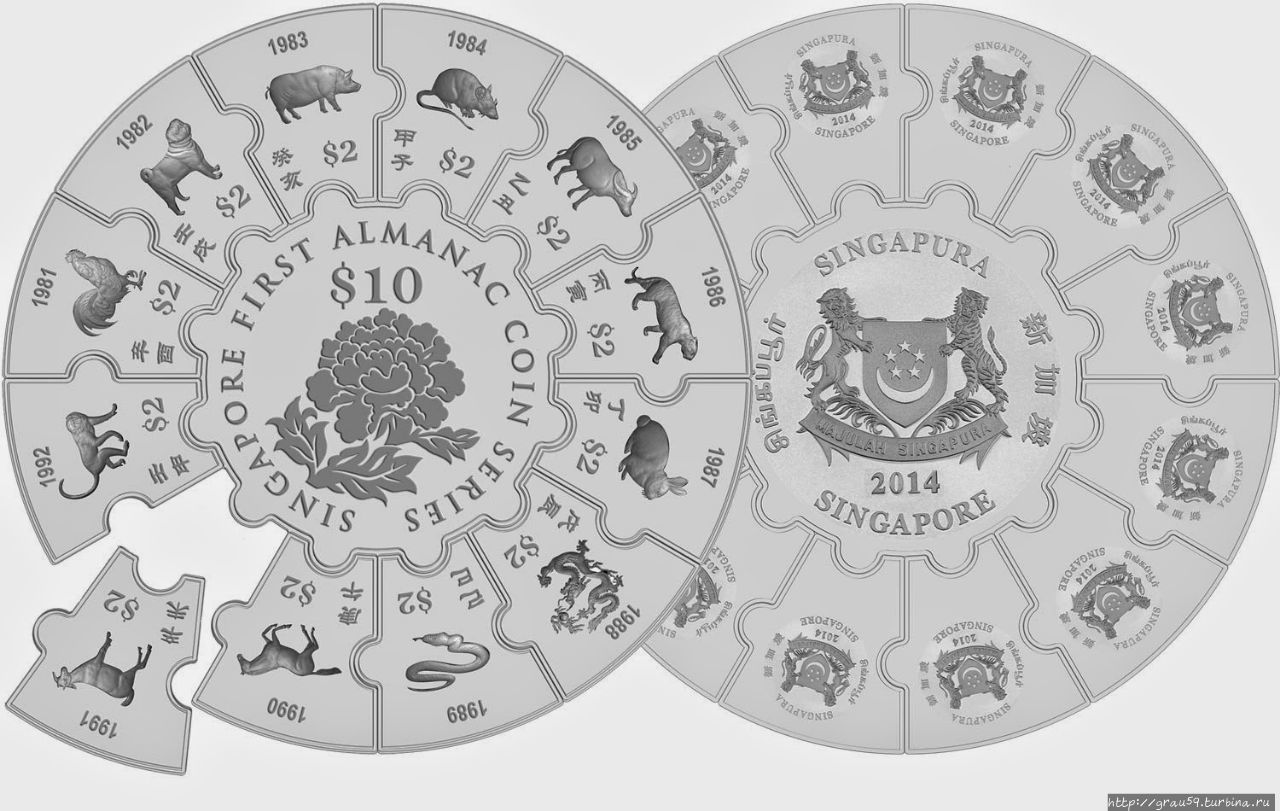 В 2014 -2016 годах были выпущены монеты- пазлы серии "Лунный Альманах" ("Lunar Almanac"). Каждая монета данной серии состоит из 13 частей: центральной и 12-ти составных частей.