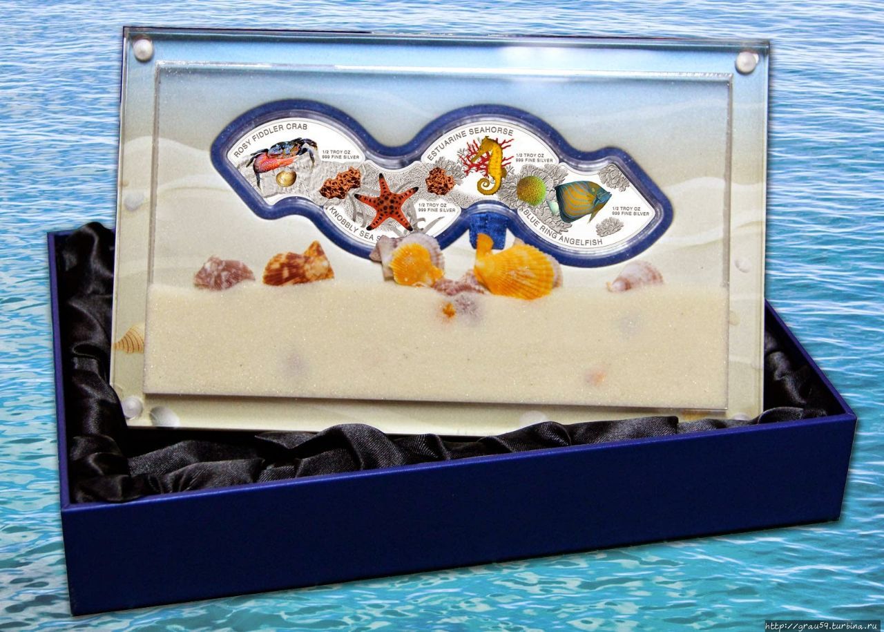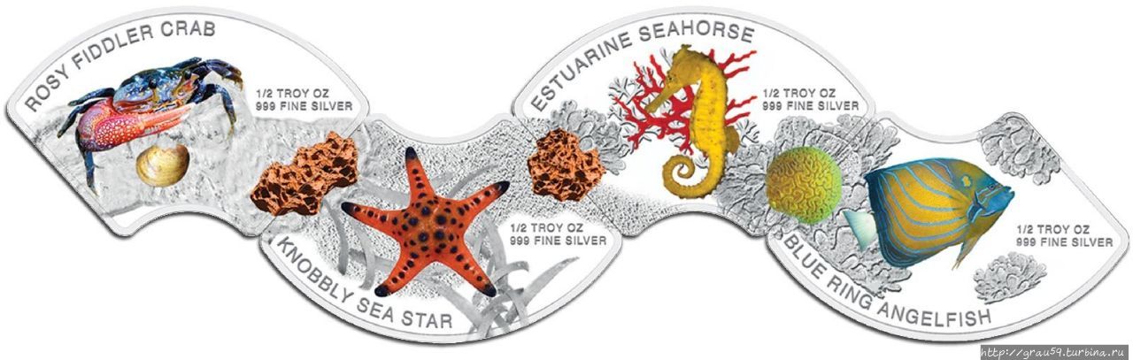 Аверс: каждая из четырех монет содержит цветное изображение одного из представителей морской фауны, расположенного на монохромном фоне морского дна. Краб, морская звезда, морской конек, рыба-ангел соседствуют с информационными данными о составе металла и весе изделия — «1/2 TROY OZ 999 FINE SILVER». Также на монетах указаны названия обитателей водных глубин.
