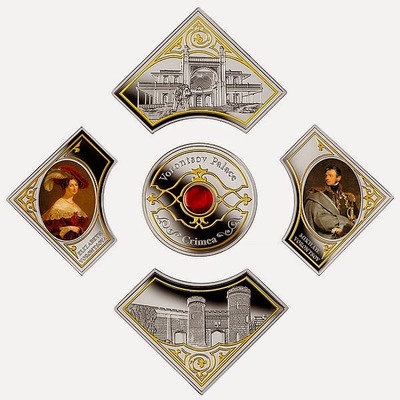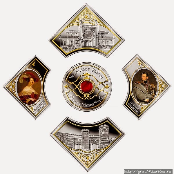 В реверс центральной монеты вставлен кусочек карнеола (сердолика), минерала, напоминающего о знаменитом подарке княгини Воронцовой Александру Пушкину. В верхней части полукругом написано – «Vorontsov Palace» («Воронцовский дворец»), в нижней части расположена надпись – «Crimea» («Крым»).