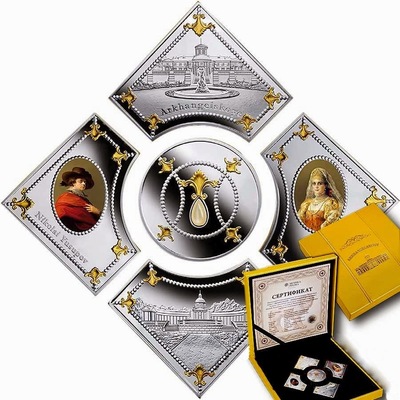 На реверсе круглой монеты изображен элемент декора ограды усадьбы Архангельское, на реверсе нестандартных монет — фасад поместья, Храм-усыпальница Юсуповых, портрет Зинаиды Юсуповой, портрет Николая Юсупова, надписи с их именами. Все нестандартные монеты украшены украшенные орнаментами в стиле рококо.