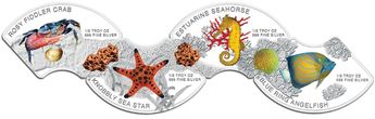 Аверс: каждая из четырех монет содержит цветное изображение одного из представителей морской фауны, расположенного на монохромном фоне морского дна. Краб, морская звезда, морской конек, рыба-ангел соседствуют с информационными данными о составе металла и весе изделия — «1/2 TROY OZ 999 FINE SILVER». Также на монетах указаны названия обитателей водных глубин.