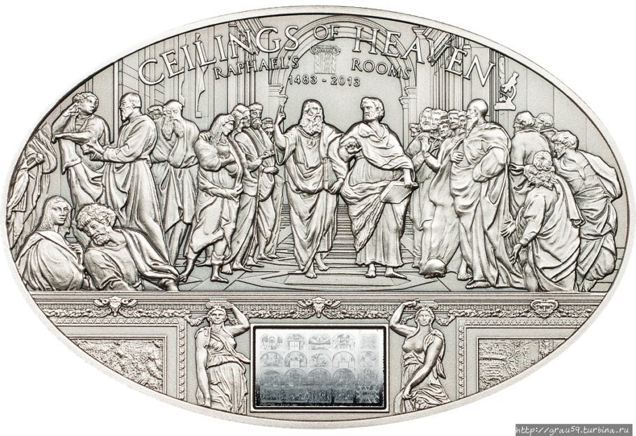 Станцы Рафаэля – четыре помещения в папском дворце Ватикана, расписанные по поручению папы Юлия II Рафаэлем и его учениками. На реверсе монеты изображен фрагмент фрески "Афинская школа»", расположенной в станце делла Сеньятура Ватиканского дворца.