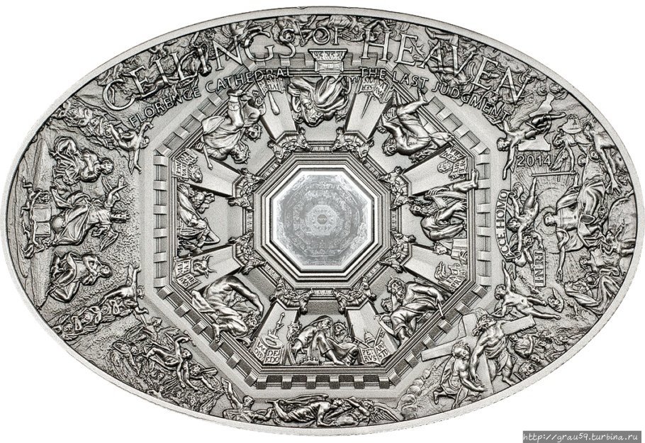 На наночипе выгравированы знаменитые фрески Сикстинской Капеллы кисти Микеланджелло, которые можно до мельчайших деталей рассмотреть только под микроскопом!Серебряная монета 5 долларов. Серия — "Потолки небес" (Ceilings of Heaven). Известный тираж -999.