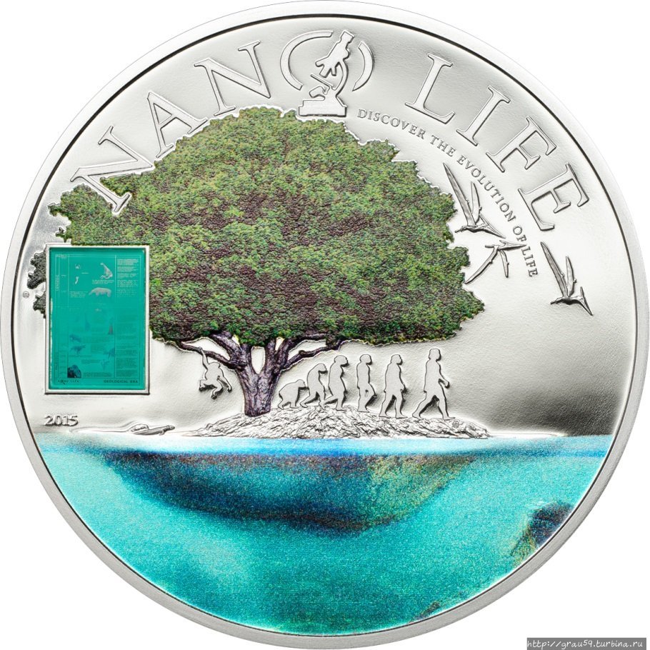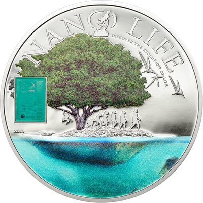 Монета посвящена эволюции жизни на Земле — об этом можно судить по информации, размещенной на наночипе. На монете показан процесс эволюции жизни – от низших форм (водоплавающих, летающих ящеров, обезьян) к высшим (человеку).