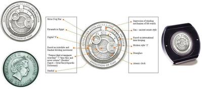На реверсе первой монеты – цветное изображение стрелок часов на фоне часовых циферблатов, а также чеканные изображения различных видов часов и приблизительное время их появления (изобретения): солнечные (1500 до н.э.), водяные (1400 до н.э.), песочные (150 до н.э.), механические (723), пружинные (1510), маятниковые (1656), атомарные (1949), электронные (1956).