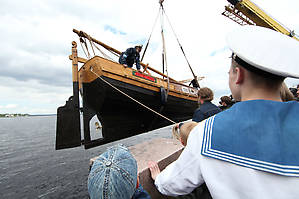 Тишина взорвалась криками «ура», коч, врезавшись в спокойную гладь воды, всплывает на ровный киль. Отданы швартовые и судно, словно осаженный на бегу скакун, замирает у причала. Этот день строители считают своим праздником, надолго сохраняя в памяти дату спуска судна. Традиционно корабелы торжественно вручают символические ключи и паспорта суден, а те в ответ щедро их одаривают за работу.