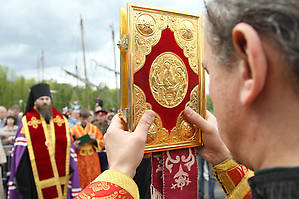 Во время молебна судно с поднятыми на нем флагами — императорским штандартом (в нашем случае триколор и флаг экспедиции), кормовым Андреевским флагом и гюйсом — священник окроплял святой водой. Под звуки гимна и артиллерийского салюта с других кораблей клуба «Полярный Одиссей» наши суда сошли со стапелей в воду, правда, с использованием подъемного крана.