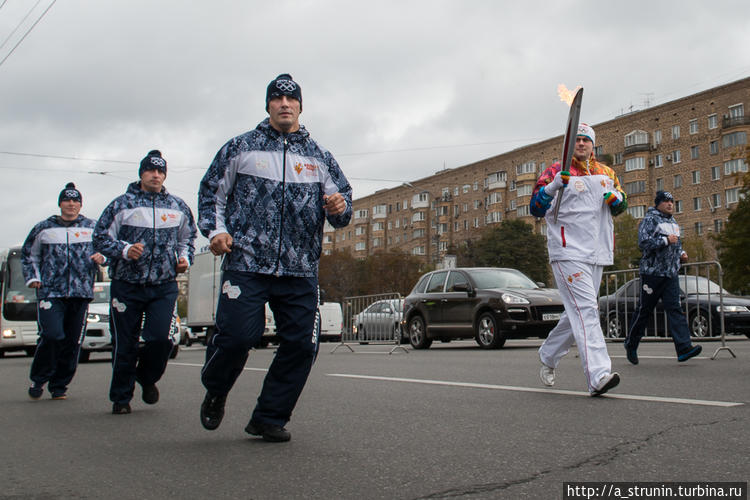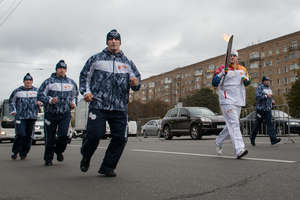 По сторонам «дежурного» факелоносца бегут крепкие парни, скорее всего фэсэошники. И хоть они тоже в спортивных костюмах, но дружелюбными выражения их лиц вовсе не назовешь. Особенно, когда происходит остановка и передача огня от одного факелоносца другому, до этого ехавшего в автобусе. При остановке колонны парни резко присаживаются на одно колено и пристально вглядываются в прохожих. Ну вот чего они охраняют, кому надо это факел отбирать?..